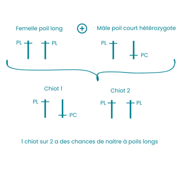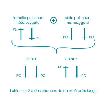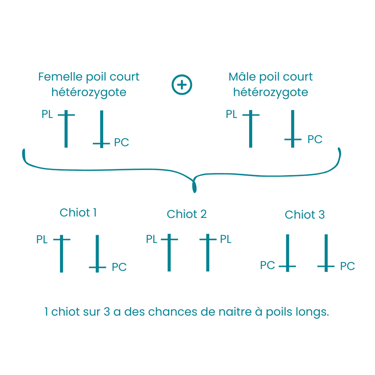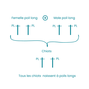 Cela signifie qu'un couple où les 2 parents sont poils longs auront obligatoirement des chiots poils longs, mais à l'inverse, chez un couple où les 2 (ou un seul) parents sont poils courts donneront naissance aléatoirement à des chiots poils courts ou longs.